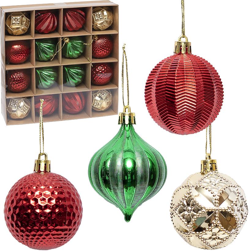 Набір ялинкових іграшок у формі кульок включає 16 штук іграшок різних кольорів. У наборі є три різні кольори для створення різноманітності і жвавості в прикрасі ялинки. Кожна кулька має діаметр 6 см.